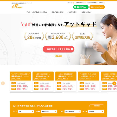 - 業種分野・職種・使用CADソフト・設計スキルなどを細かく把握した上で求人を紹介してくれる